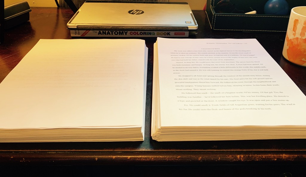 Time-wise, it’s an ongoing struggle to find time to edit during the work week, but I usually manage Friday night, Saturday, and Sunday, so I’m still making headway. Sure, my end goal of finishing the second draft (including transferring edits to the computer) by the end of the year may be a pipe dream, but we’ll see! I’ve promised myself not to rush the project to meet arbitrary, self-imposed deadlines. Slow and steady wins the race (or at least makes for a quality final draft).